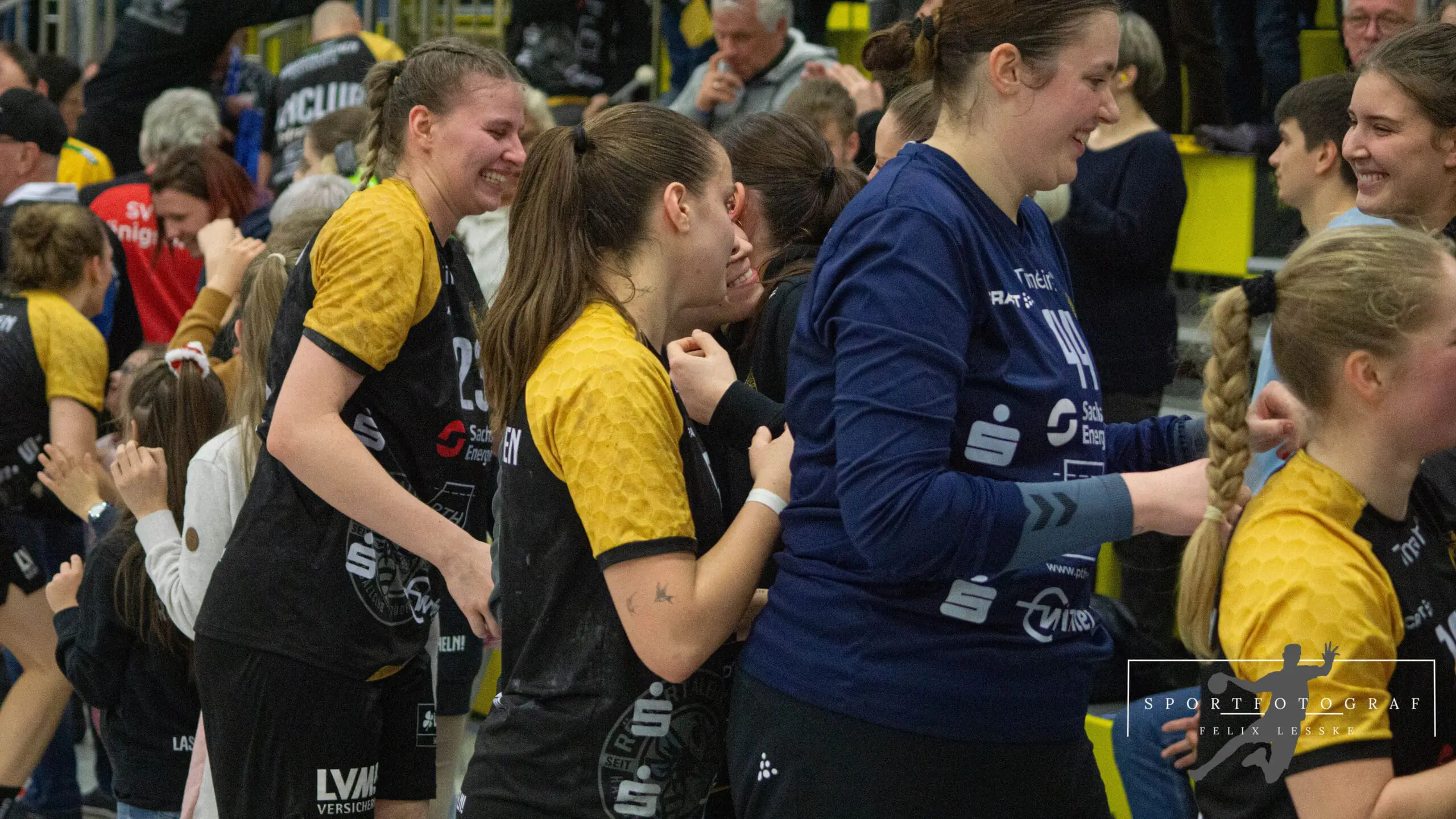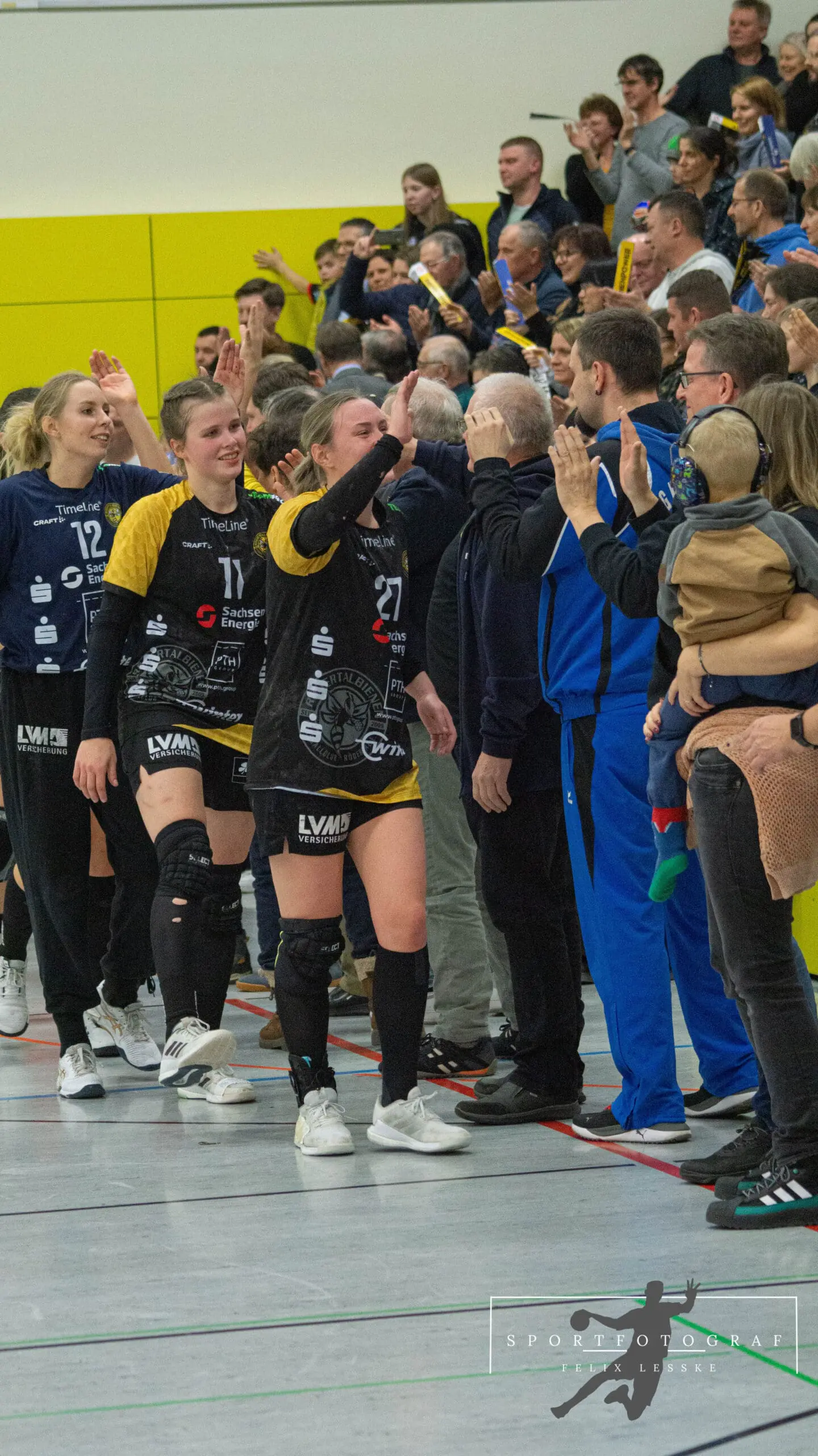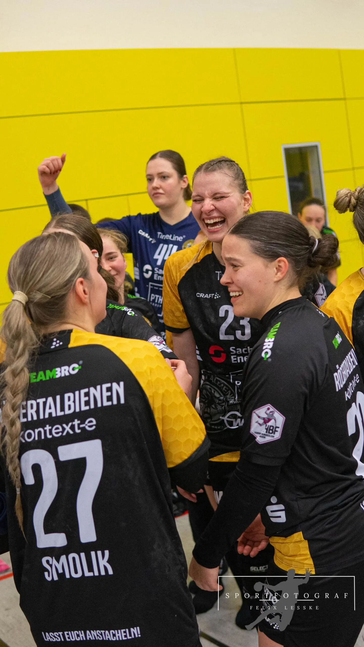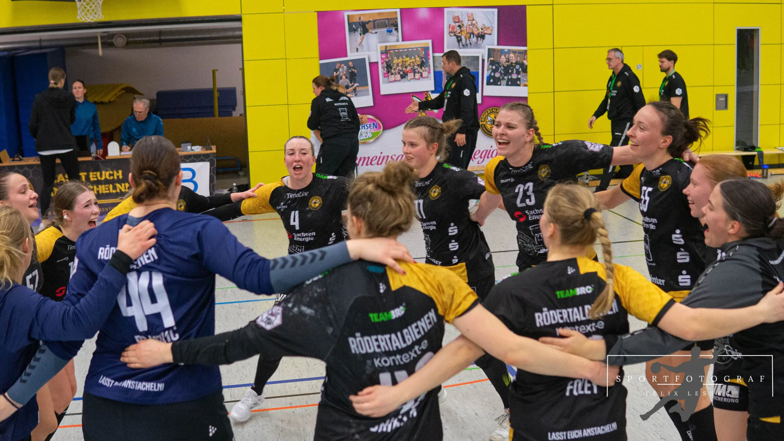 Im Anschluss folgten die vielleicht entscheidenden Szenen im Spiel. Vanessa Huth bekam eine mehr als umstrittene Zeitstrafe und auch gleich darauf gab es noch einen unglücklichen Pfiff der Schiedsrichter gegen die Bienen. Die Stimmung in der Halle war dadurch über dem Siedepunkt und die Bienen voller Wut im Bauch. Mit dieser erkämpften sie sich den Ball in der Abwehr und im Angriff schaffte es Jasmin Eckart sich durchzusetzen. Fabienne Büch setzte nach einen Ballgewinn noch einen Treffer zum 2:0 in Unterzahl drauf. Das Spiel war entschieden – alle Zuschauer in der Halle standen da schon lange und feierten die letzten Spielminuten zum 25:20 Sieg der Bienen.