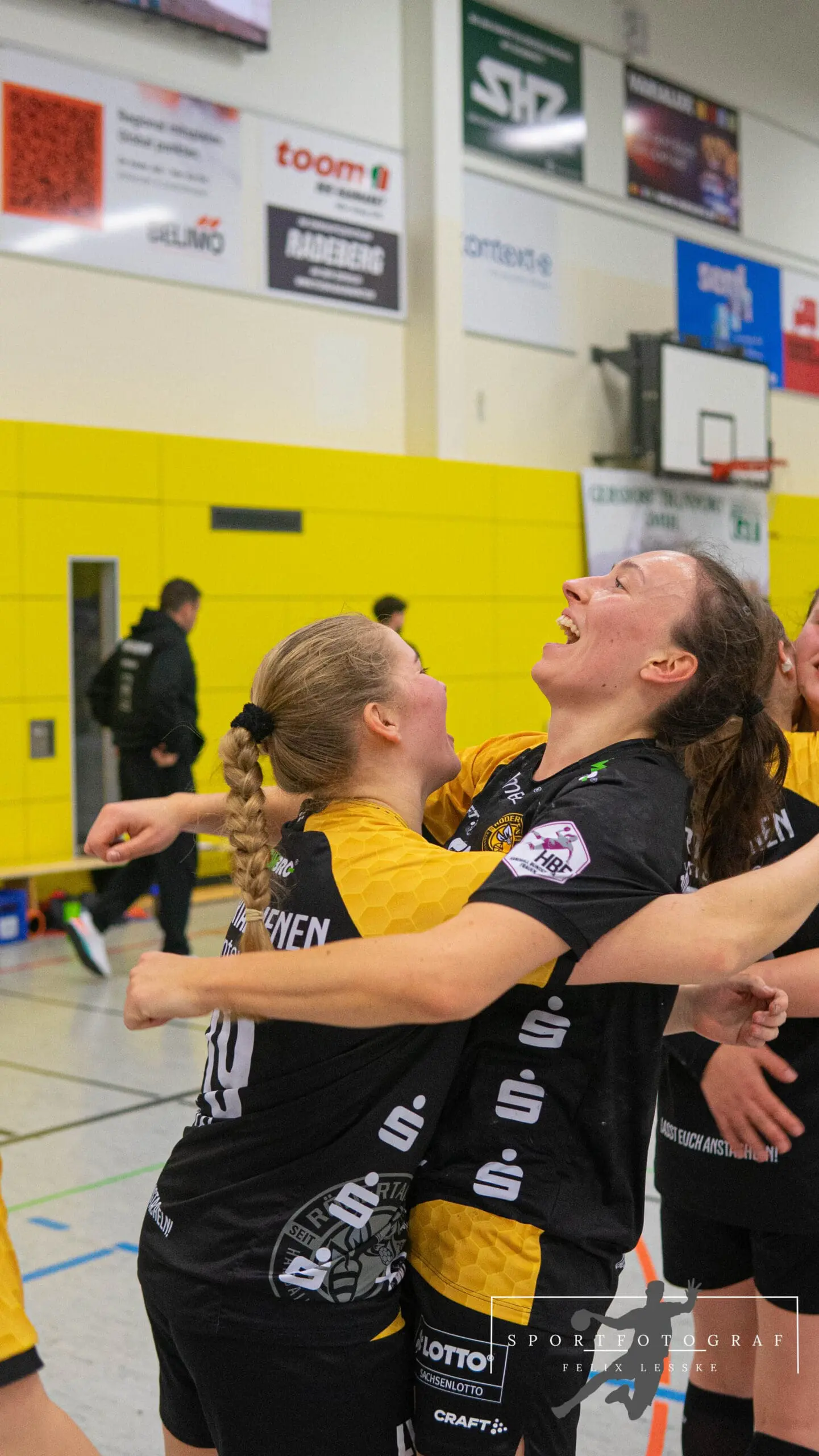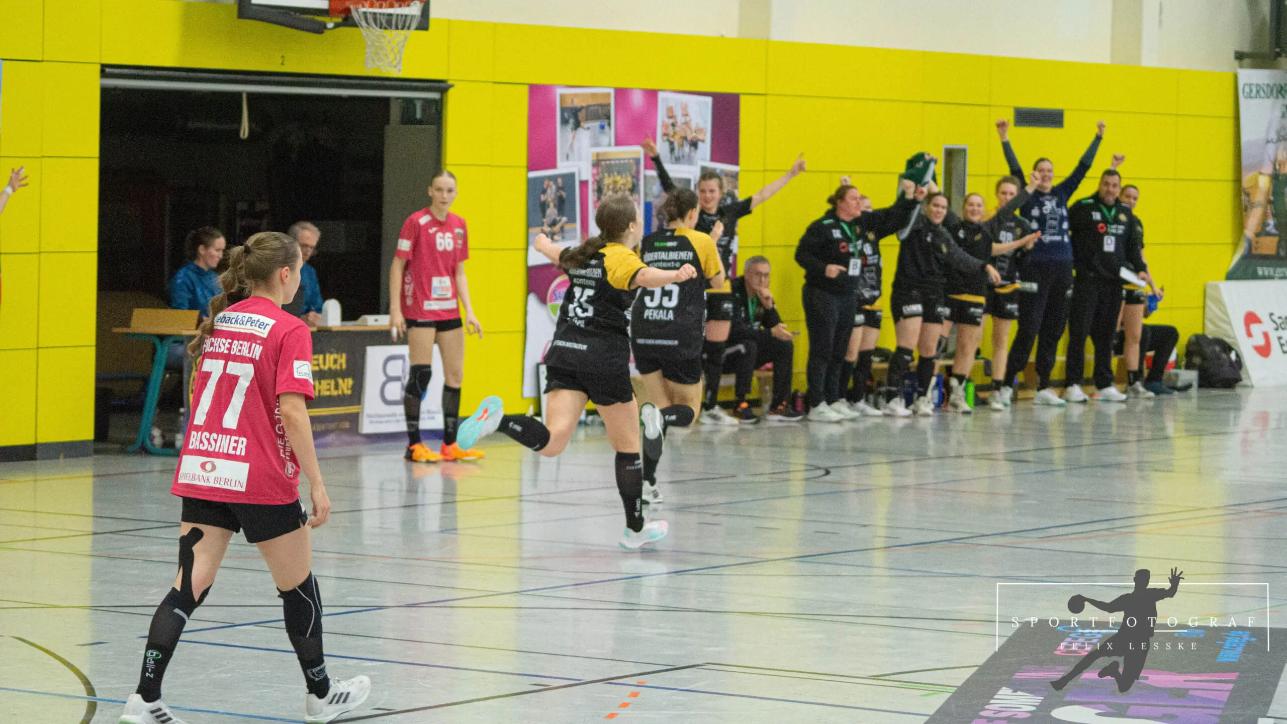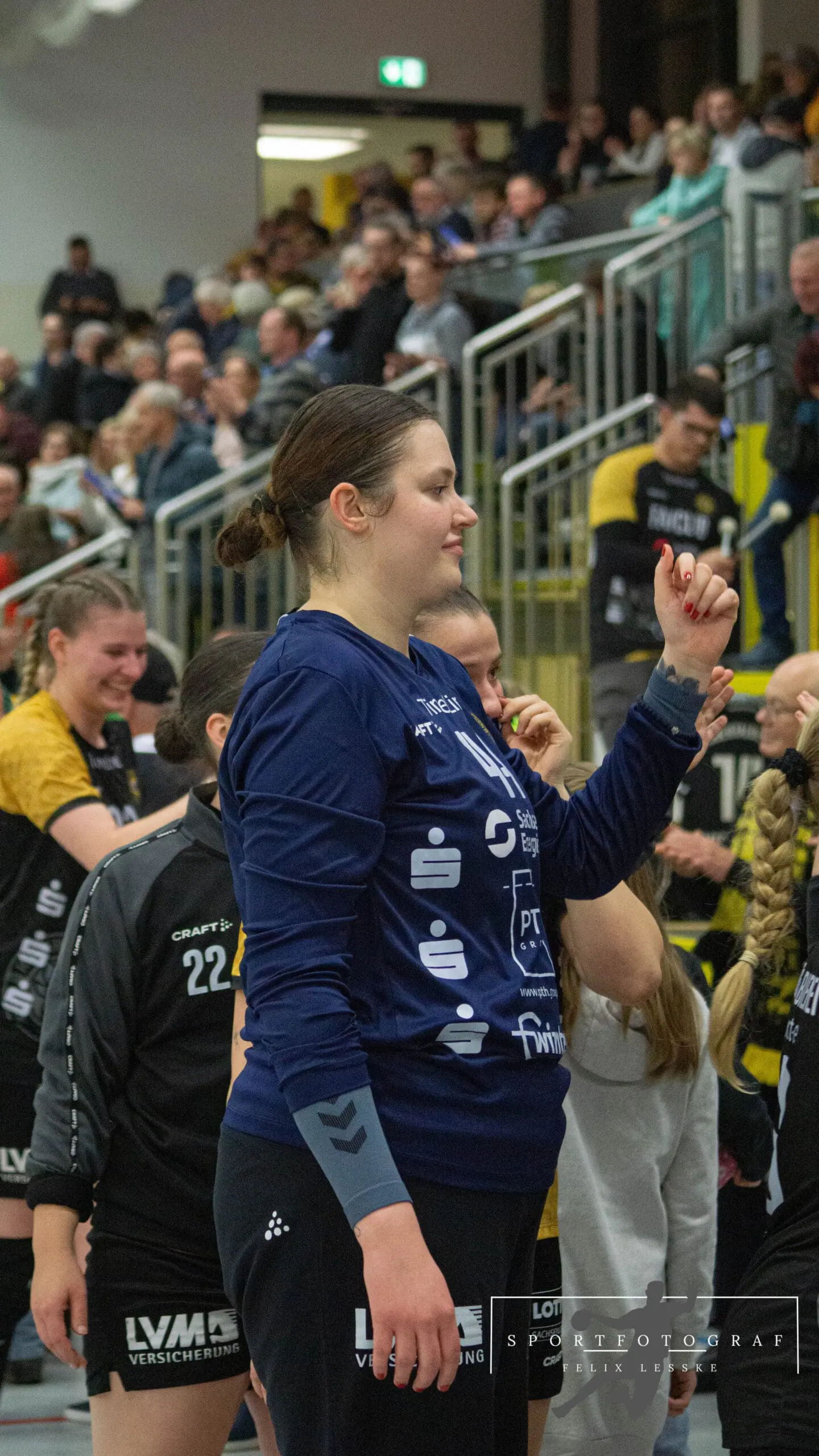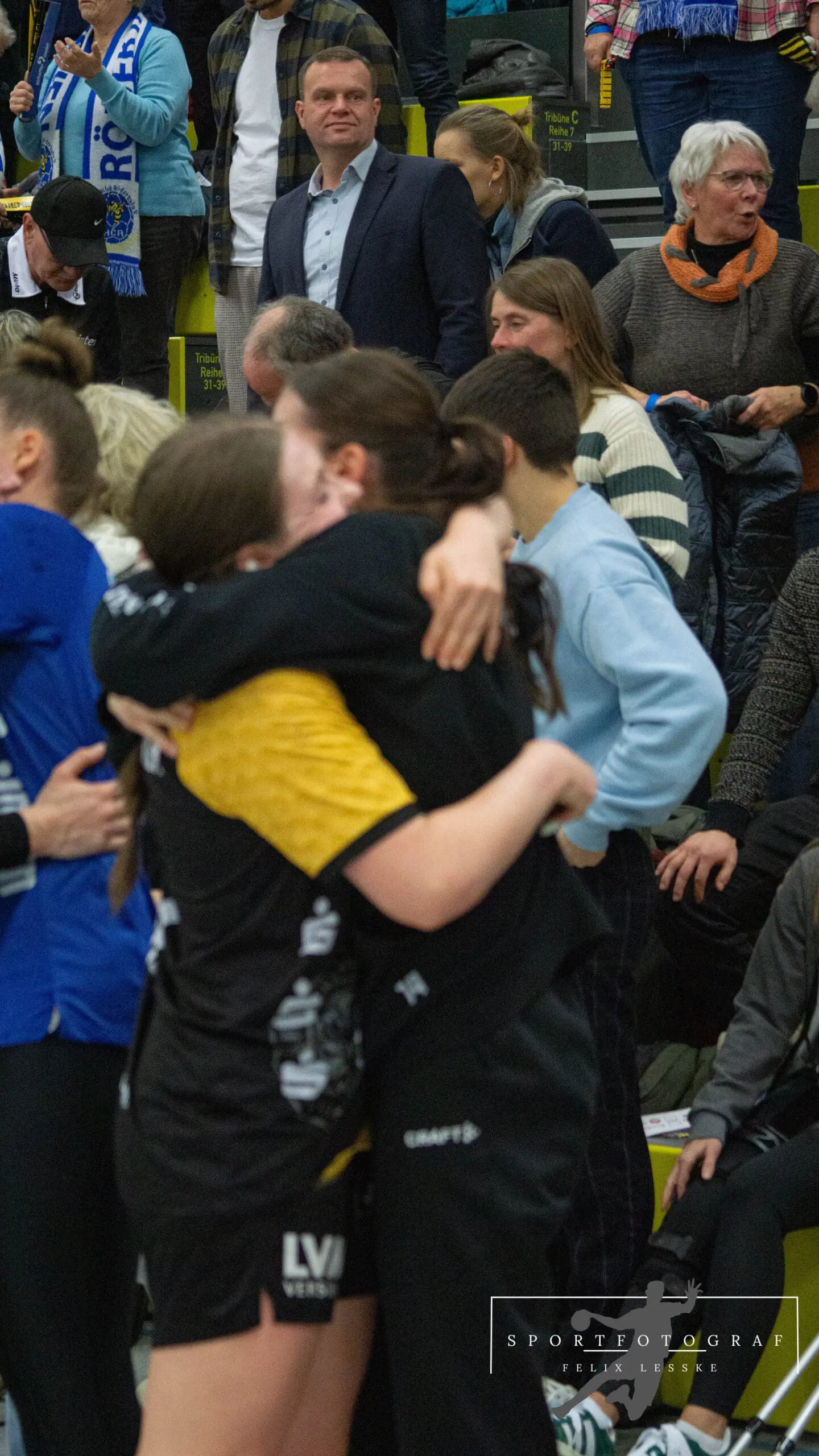 Im Anschluss folgten die vielleicht entscheidenden Szenen im Spiel. Vanessa Huth bekam eine mehr als umstrittene Zeitstrafe und auch gleich darauf gab es noch einen unglücklichen Pfiff der Schiedsrichter gegen die Bienen. Die Stimmung in der Halle war dadurch über dem Siedepunkt und die Bienen voller Wut im Bauch. Mit dieser erkämpften sie sich den Ball in der Abwehr und im Angriff schaffte es Jasmin Eckart sich durchzusetzen. Fabienne Büch setzte nach einen Ballgewinn noch einen Treffer zum 2:0 in Unterzahl drauf. Das Spiel war entschieden – alle Zuschauer in der Halle standen da schon lange und feierten die letzten Spielminuten zum 25:20 Sieg der Bienen.