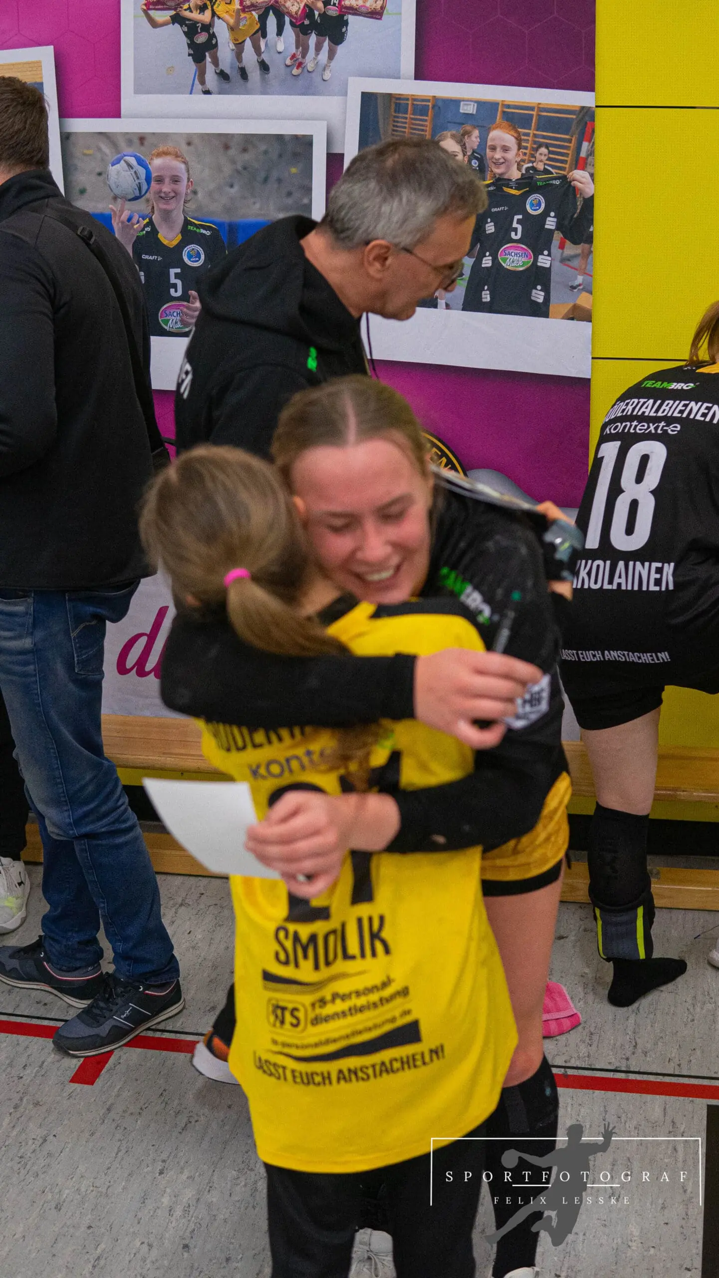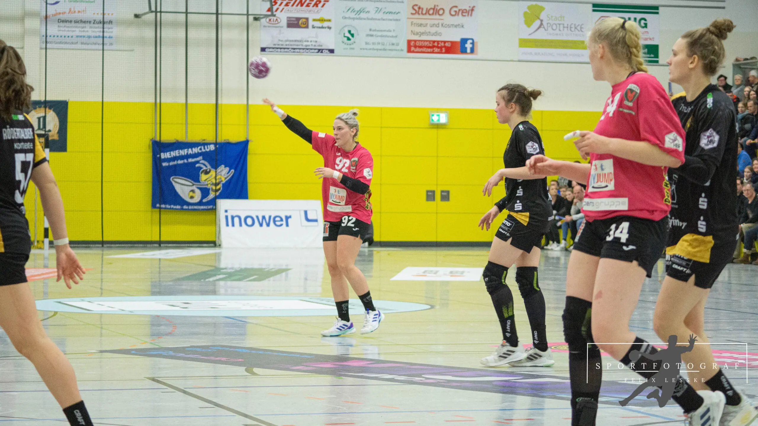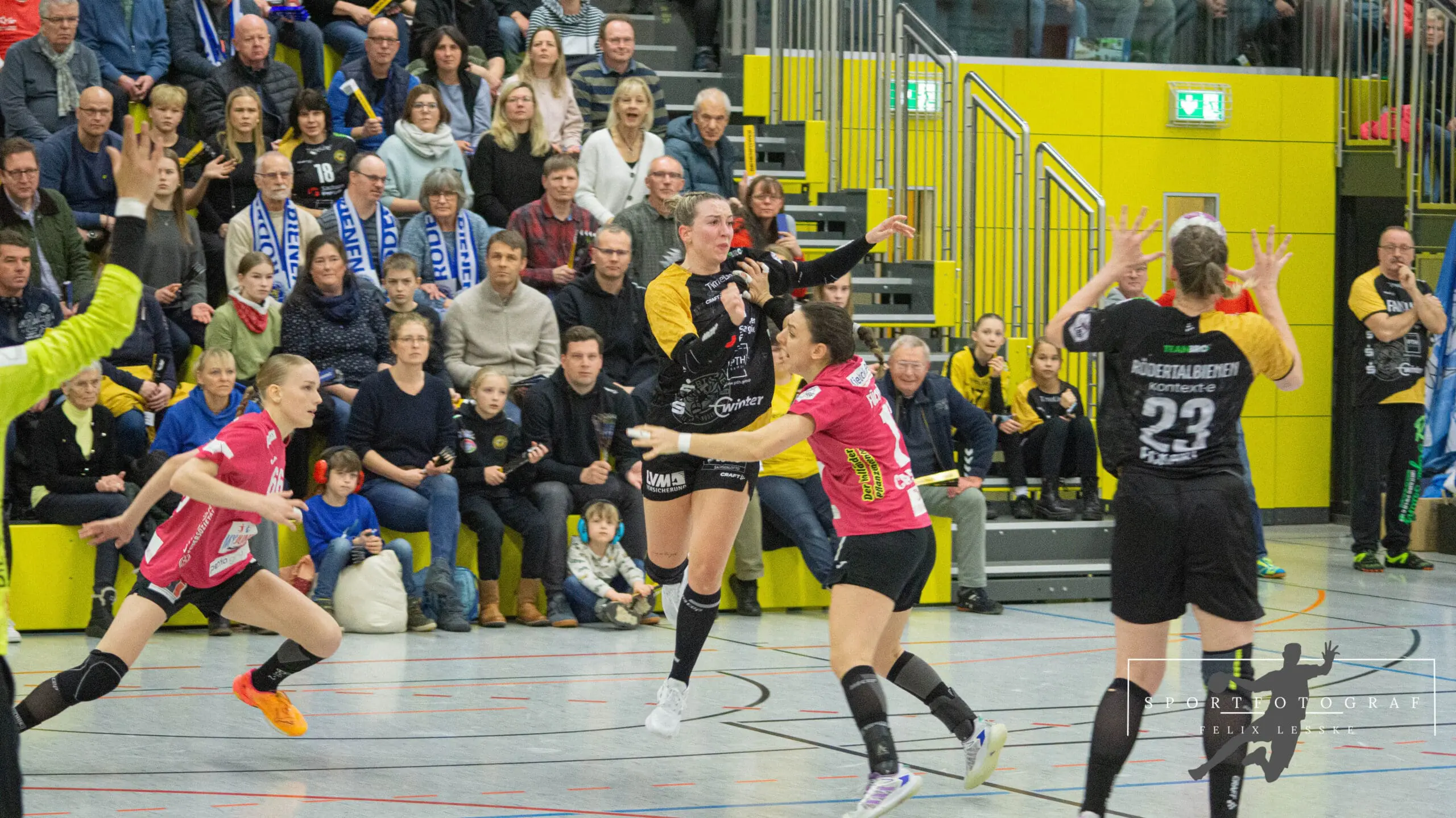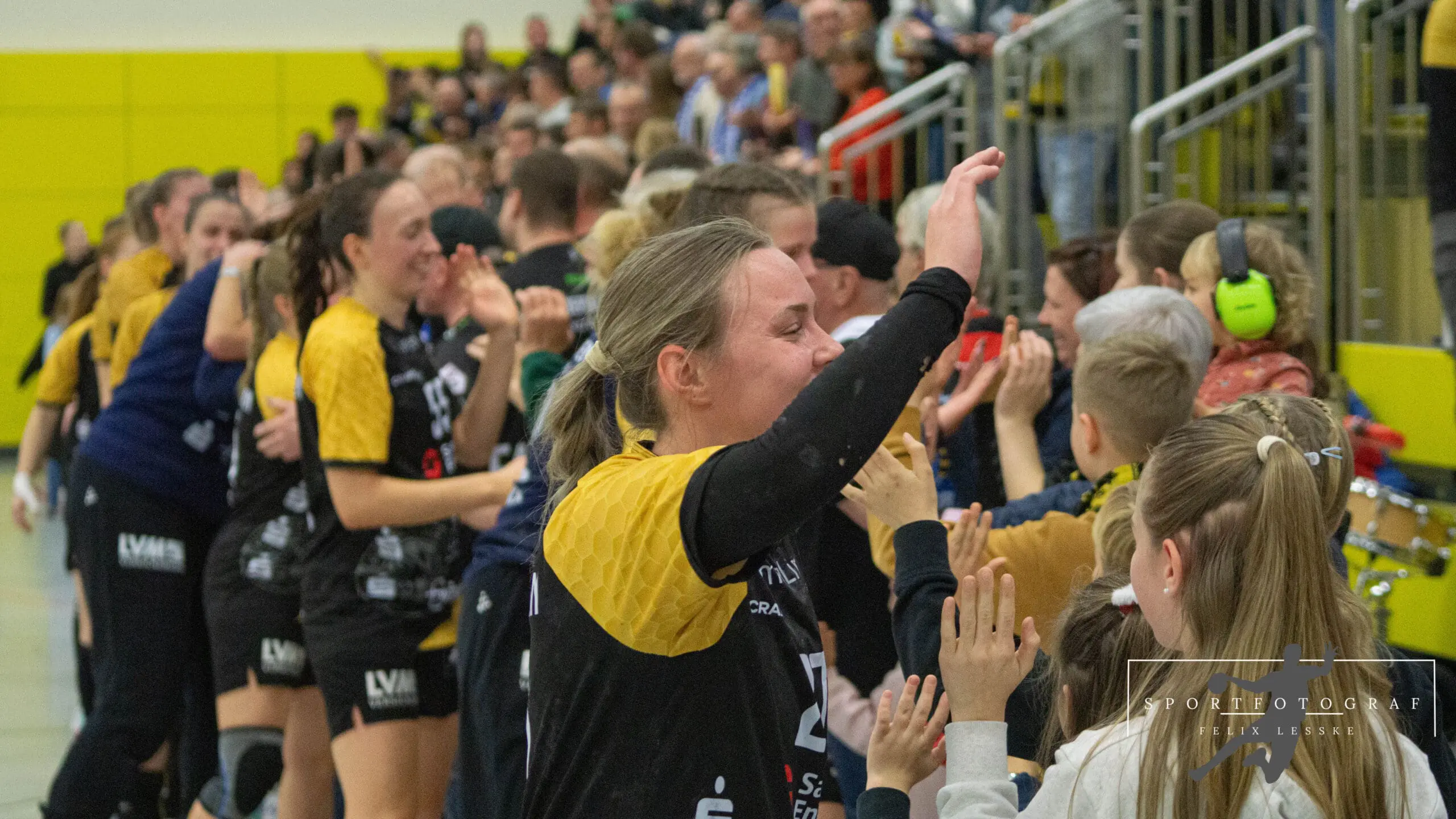 Im Anschluss folgten die vielleicht entscheidenden Szenen im Spiel. Vanessa Huth bekam eine mehr als umstrittene Zeitstrafe und auch gleich darauf gab es noch einen unglücklichen Pfiff der Schiedsrichter gegen die Bienen. Die Stimmung in der Halle war dadurch über dem Siedepunkt und die Bienen voller Wut im Bauch. Mit dieser erkämpften sie sich den Ball in der Abwehr und im Angriff schaffte es Jasmin Eckart sich durchzusetzen. Fabienne Büch setzte nach einen Ballgewinn noch einen Treffer zum 2:0 in Unterzahl drauf. Das Spiel war entschieden – alle Zuschauer in der Halle standen da schon lange und feierten die letzten Spielminuten zum 25:20 Sieg der Bienen.