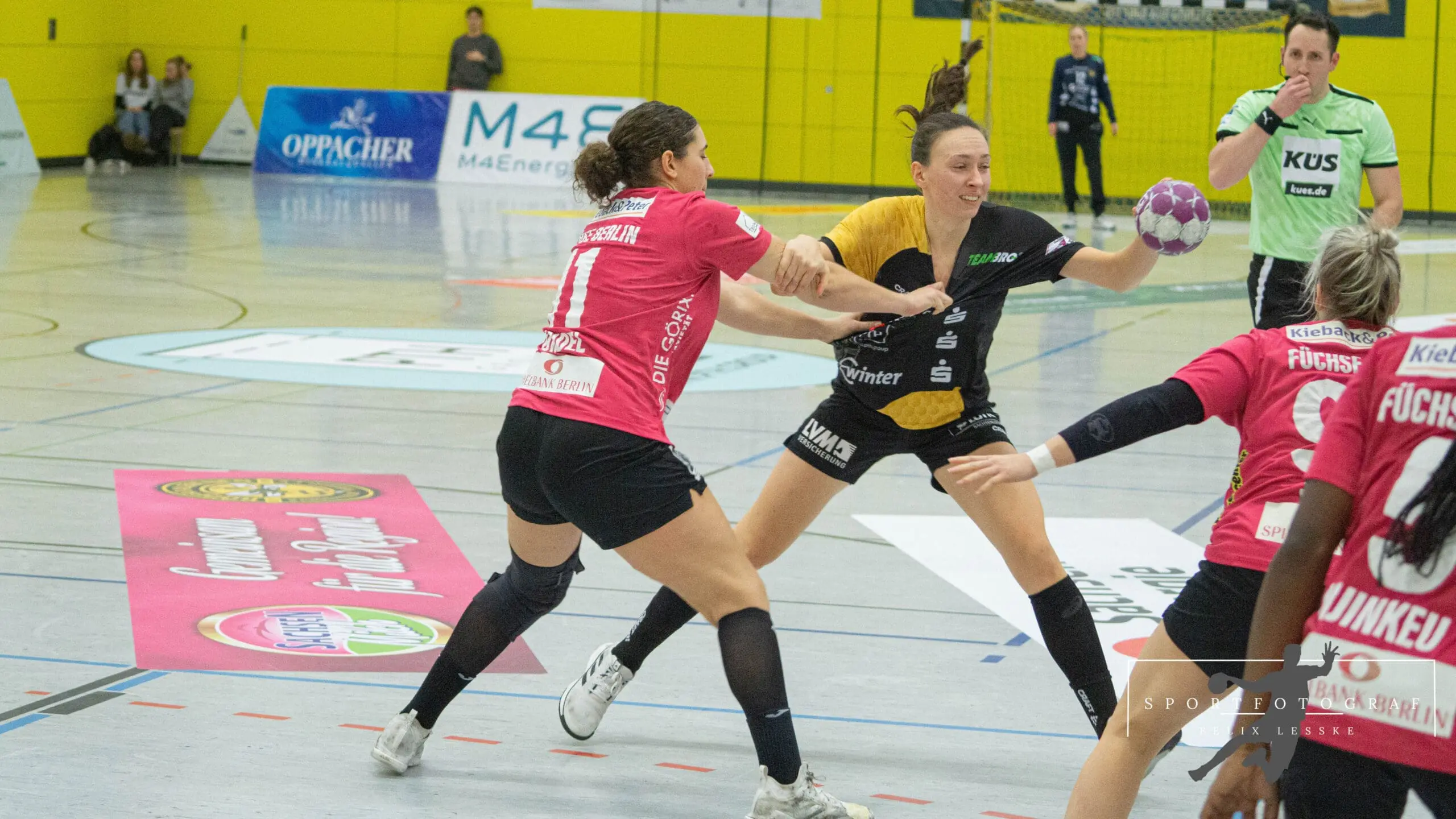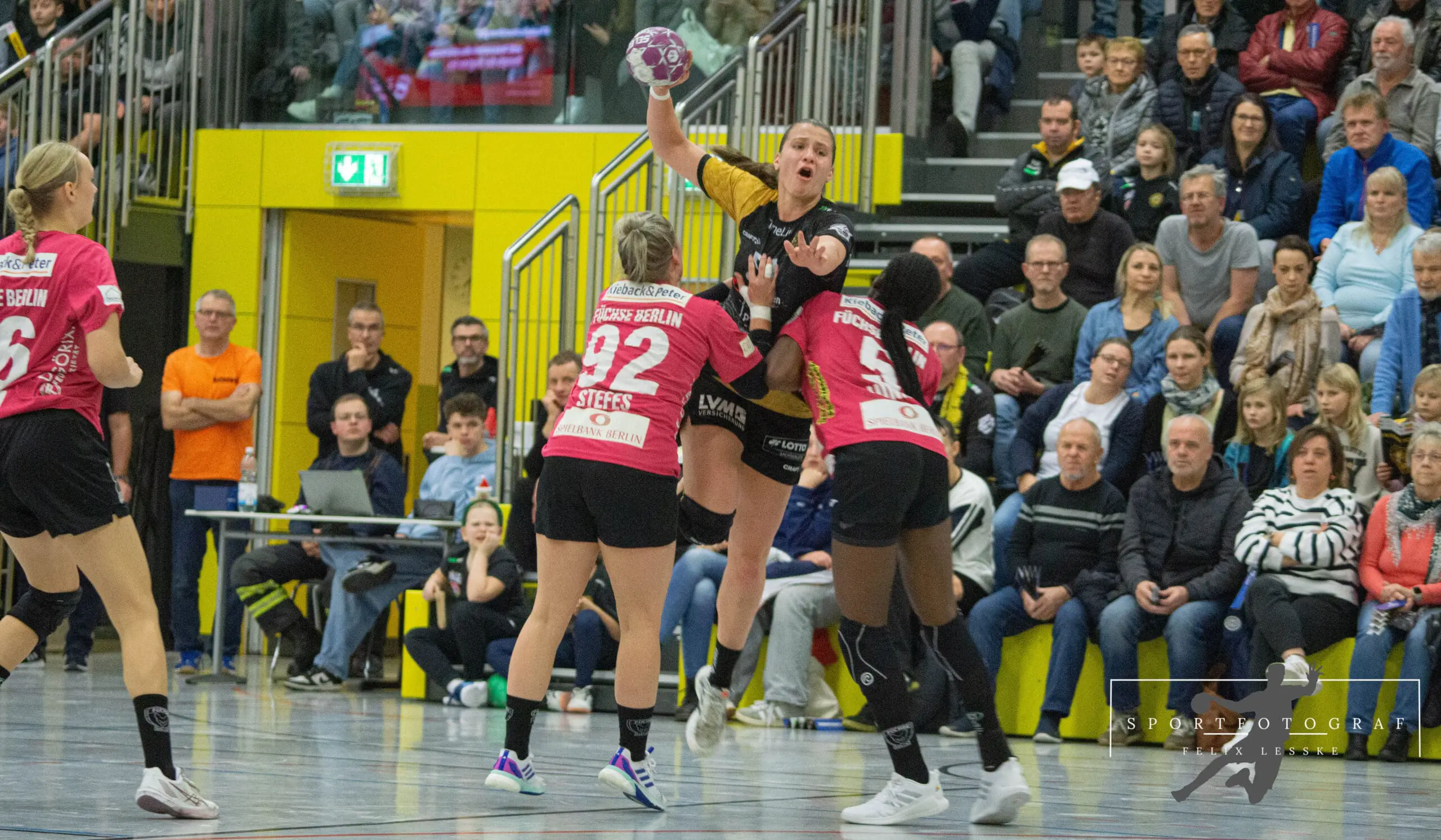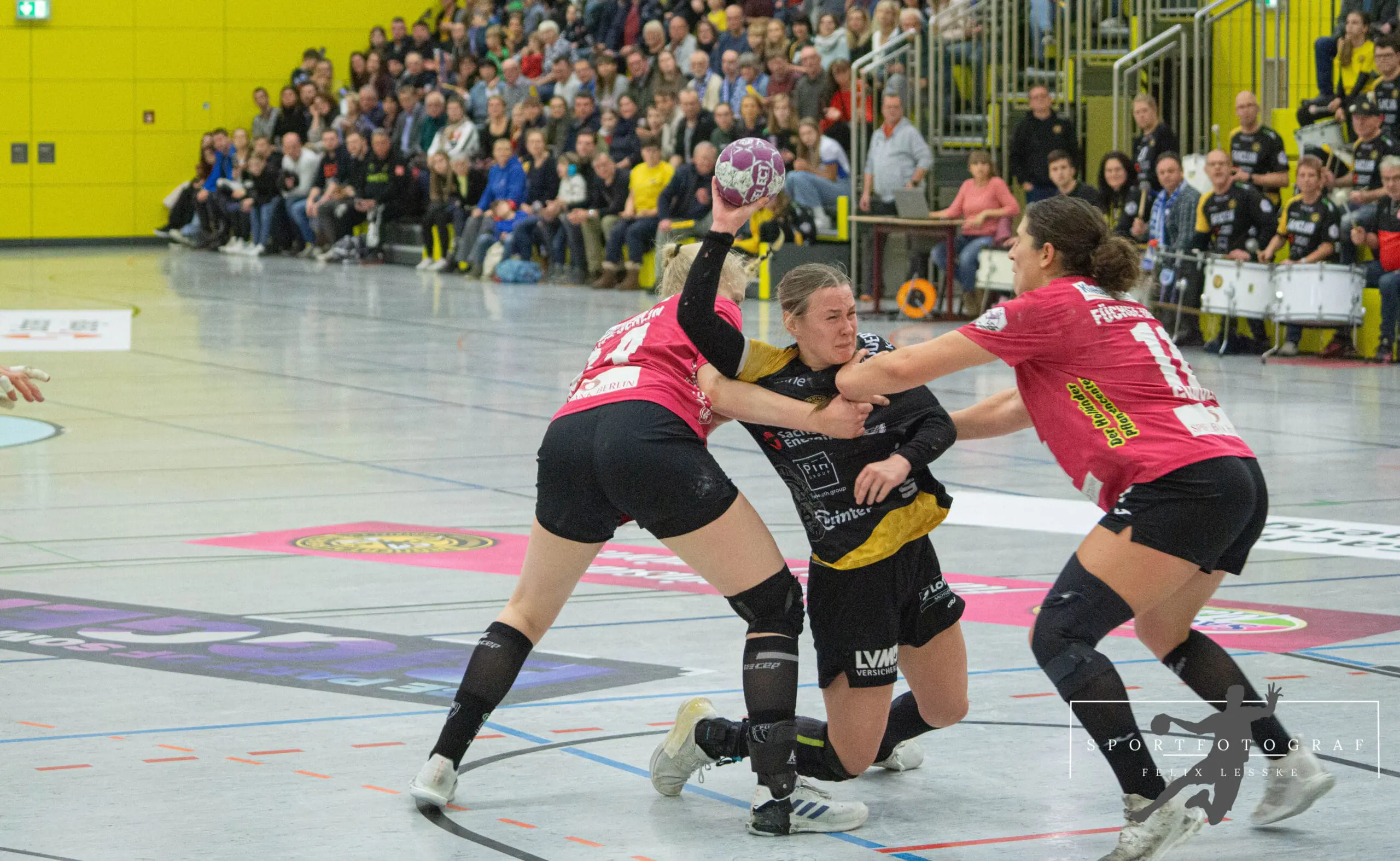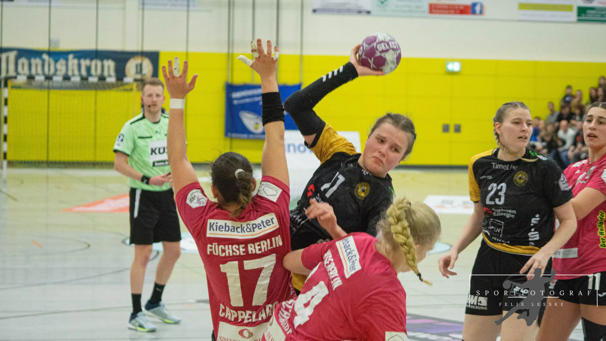 Es entwickelte sich das erwartete Spitzenspiel. Um jeden Treffer wurde erbittert gekämpft und es wurde sich nichts geschenkt. Zunächst konnten die Bienen die Führung noch behalten aber nach 48 Spielminuten leuchtete ein 17:17 auf der Anzeigetafel. Maike Daniels musste wieder mit einer Auszeit einwirken. Sollte das Spiel jetzt tatsächlich in Richtung der Berliner kippen? Nein, denn eine Frau hatte da etwas dagegegn: Oliwia Kaminska. Es heißt, man muss die wichtigen Bälle halten und genau diese Bälle hielt sie nun am laufenden Band: Frei vom Kreis, im Konter oder von Außen – Dank ihr gelang den Berlinern nicht ein einziges Mal die Führung. Dazu konnte sie sich noch selbst als Torschützin auszeichnen. Fabienne Büch behielt in der heißen Schlussphase Nerven aus Stahl und erzielte per 7-Meter die 22:19 Führung. Da waren aber immer noch 5 Minuten zu spielen.