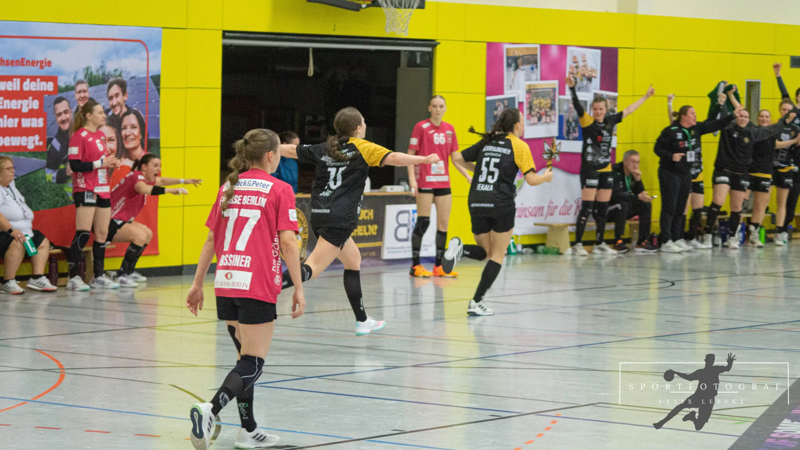 Nach dem 2:2 durch die beste Berlinerin, Ferelle Njinkeu, spielten sich die Bienen in einen kleinen Rausch. Aufbauend auf überragenden Paraden von Kaminska im Tor kam der Rödertal-Express jetzt richtig in Fahrt. Mauksch, zweimal Eckart, Pekala und Büch sorgten mit ihren Treffern in sechs Minuten für eine 7:2 Führung. Berlin reagierte mit einer Auszeit um den Lauf der Bienen zu stoppen und das gelang dann auch in der Folgezeit. Die Füchse-Abwehr packte jetzt noch mehr zu, aber die großzügigen Schiedsrichter ließen auch eine sehr harte Linie zu. Die Bienen taten sich jetzt schwerer im Angriff, so dass die Damen aus der Hauptstadt bis auf 8:5 verkürzen konnten, was wiederum eine Auszeit von Maike Daniels hervorrief.