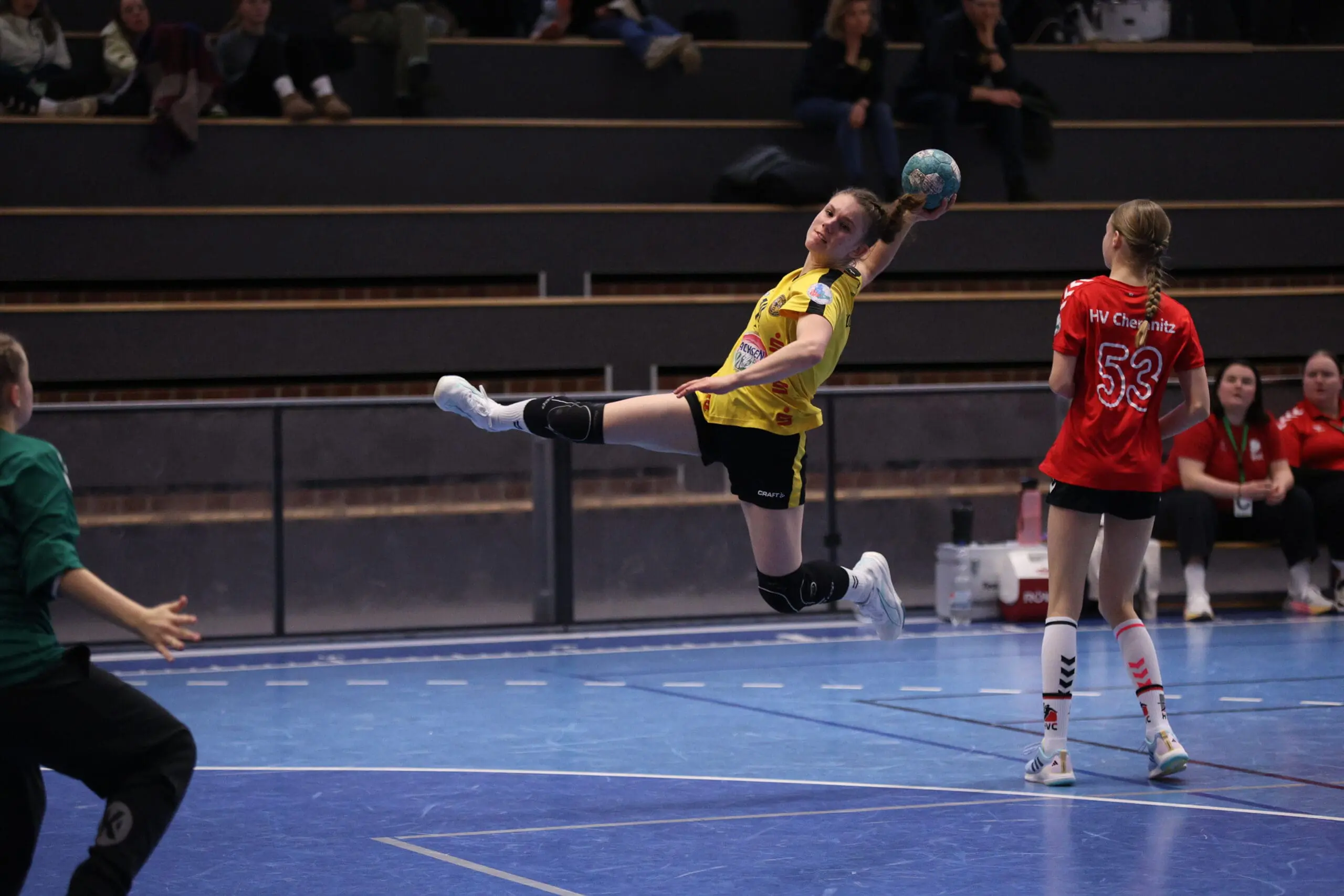 Am Sonntag, 25. Januar 2026, ging es um 14 Uhr auswärts zum HV Chemnitz. Dass viele Mädchen angeschlagen waren und auch im Trainerstab nicht alle fit durch die Woche kamen, machte die Aufgabe zusätzlich schwer. Eine Verlegung des Spiels war nicht möglich, also musste das Team die Situation annehmen, wie sie war. Und die Partie entwickelte sich entsprechend: über nahezu 50 Minuten ein enges Ringen, in dem das Eins-gegen-eins viele Szenen bestimmte, die Fehlerquote hoch blieb und die Kräfte spürbar nachließen. In der Defensive fehlte über weite Strecken die gewohnte Balance, Chemnitz kam immer wieder zu freien Abschlüssen, und zur Pause lag Rödertal mit 19:20 knapp zurück. Entscheidend war dabei, dass Annina in dieser Phase mehrere wichtige Würfe abwehrte und so dafür sorgte, dass der Rückstand überschaubar blieb.