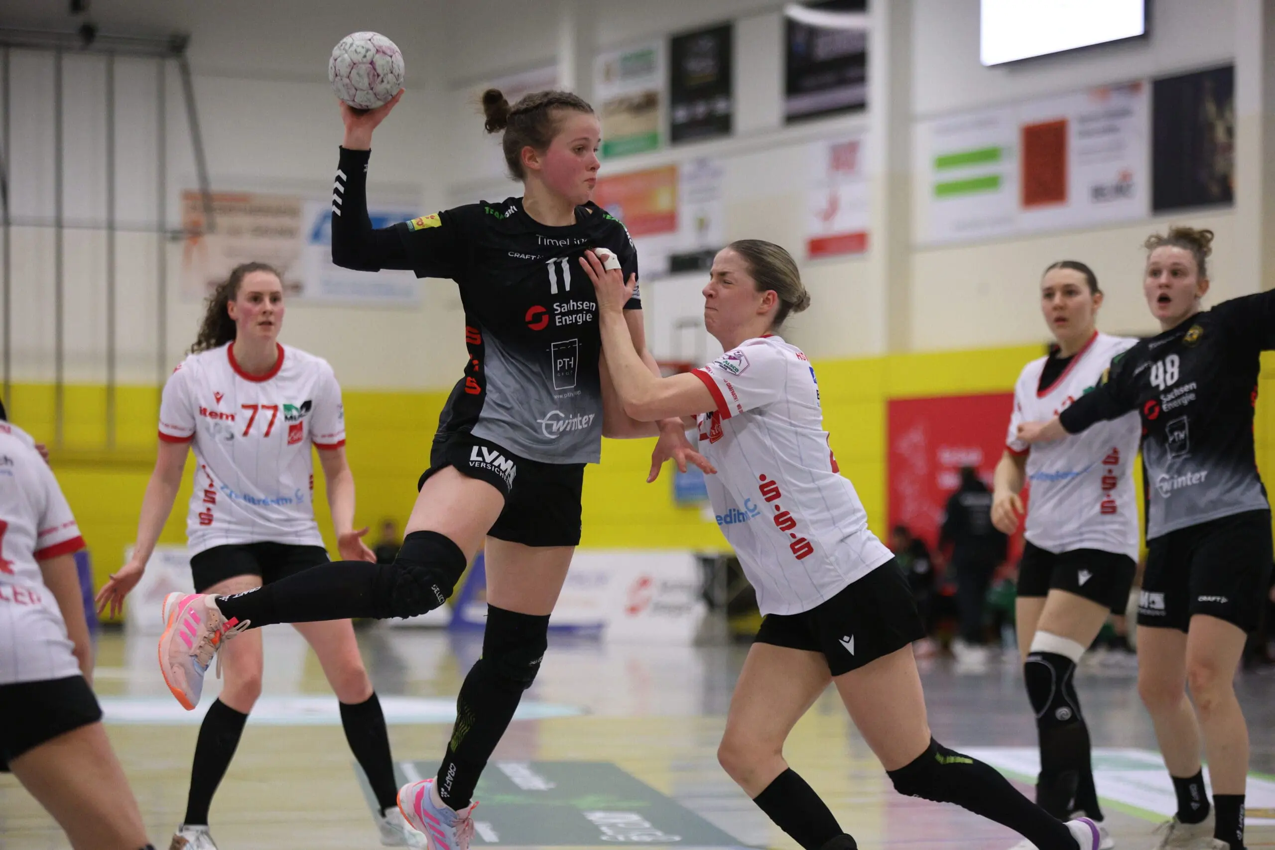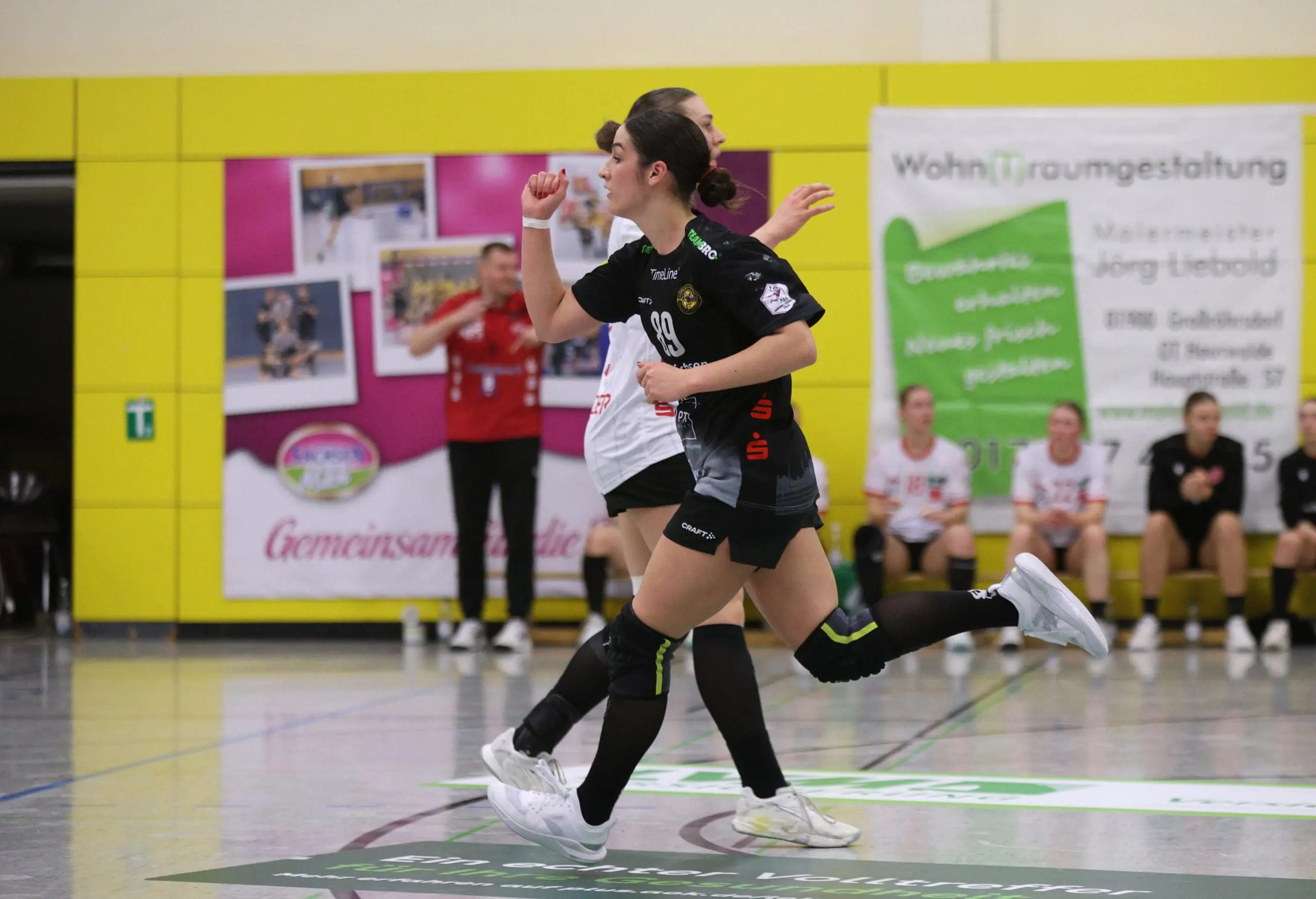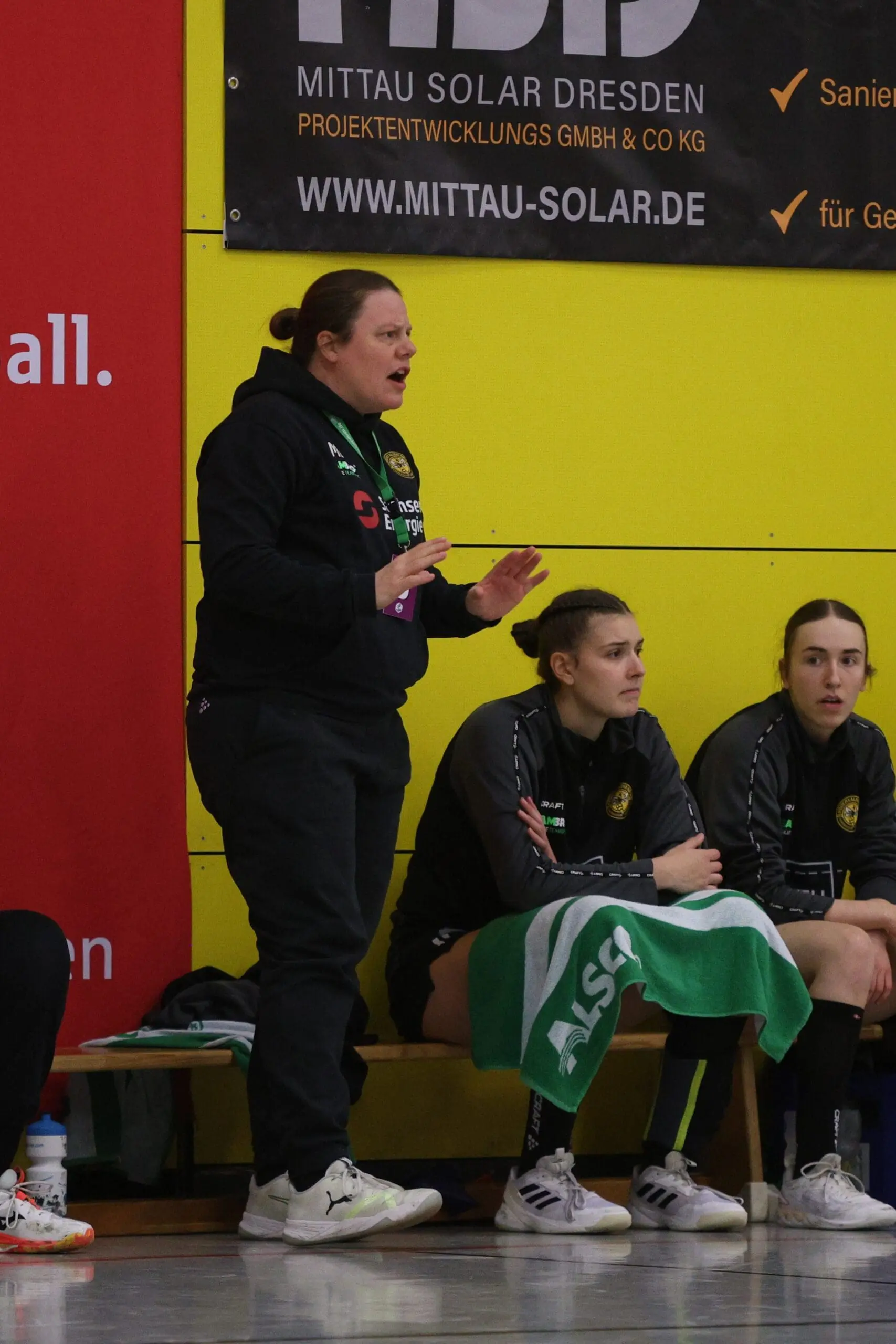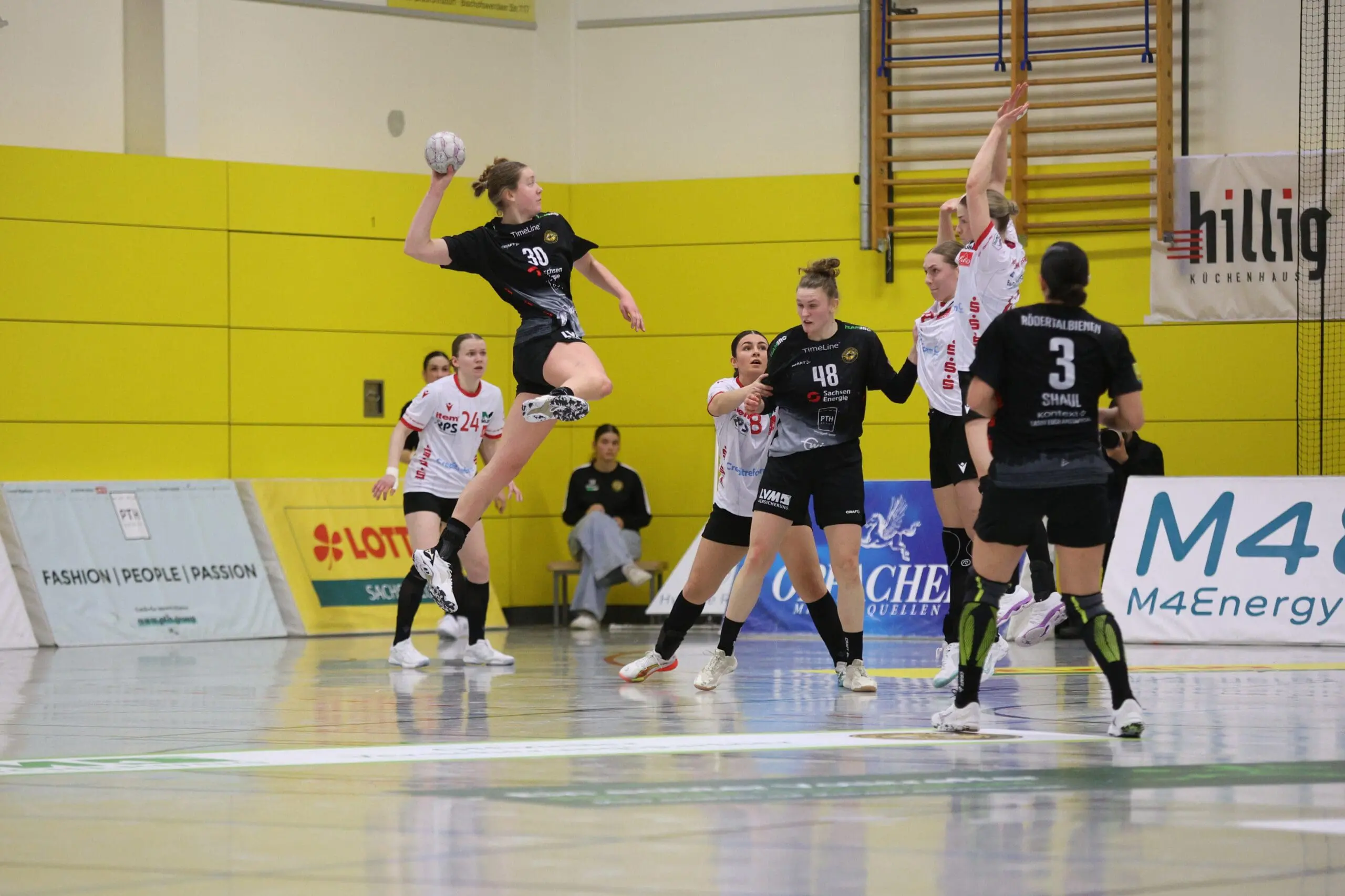 Cheftrainerin Maike Daniels hatte bereits im Vorfeld vor der Spielstärke der Solingerinnen gewarnt und ihre Vorahnung sollte sich auch bestätigen. Die Gäste begannen sehr selbstbewusst und übernahmen die Initiative. Die Rödertalbienen fanden schwer ins Spiel und machten zu Beginn des Spiels ungewohnt viele technische Fehler. Das nutzten die Gäste und gingen in der 13. Minute mit 7:4 in Führung. Daniels musste bereits früh ihre erste Auszeit nehmen und sie kam genau richtig. Sie forderte von ihrem Team eine wesentlich höhere Konzentration und konsequentere Abschlüsse. Nun kam mehr Ruhe in das Spiel und nach weiteren sechs Minuten konnte Rödertal zum 8:8 ausgleichen. Jetzt war es ein Spiel auf Augenhöhe, beide Teams schenkten sich nichts und so ging es beim 13:13 in die Halbzeitpause. Alles war noch offen und die zweite Hälfte musste die Entscheidung bringen.